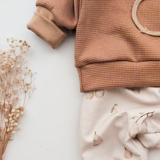 Dieser liebevoll gefertigte Sweater überzeugt durch sein zeitloses Design und hohen Tragekomfort. Der warme Naturton in Kombination mit dem dezenten Birnen-Detail macht ihn zu einem besonderen Lieblingsstück für Babys und Kinder. Der weiche Waffeljersey fühlt sich angenehm auf der Haut an und bietet viel Bewegungsfreiheit – ideal für Alltag, Spiel & Kuschelzeit.